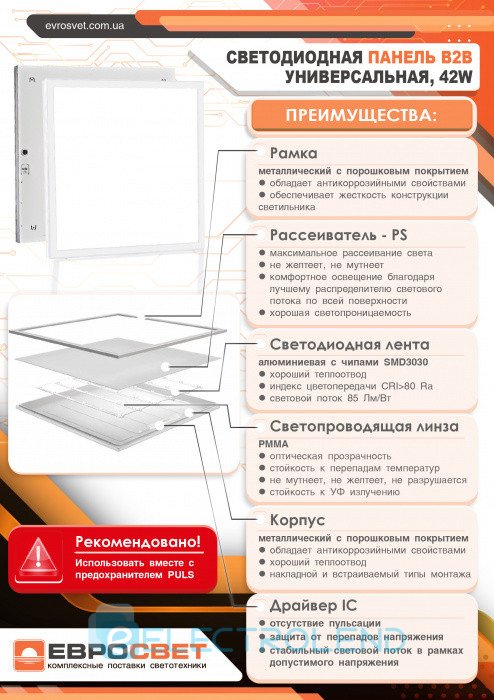 Среди характеристик светильника светодиодной панели 42Вт PANEL-B2B-595 4200K 3500Лм (универсальной) также выделяют: