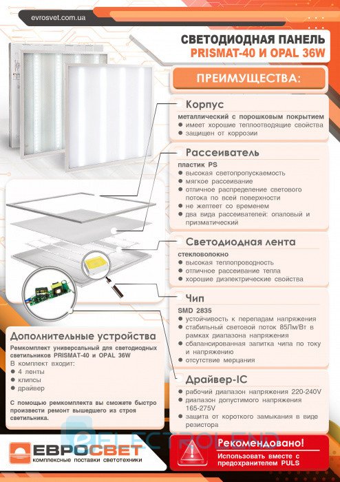 Среди других достоинств светильника светодиодной панели PRISMAT-40 4000K 3000Лм EVROLIGHT выделяют: