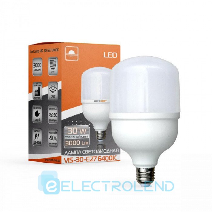Лампа светодиодная высокомощная ЕВРОСВЕТ 30Вт 6400К (VIS-30-E27) дает световой поток 3 000 Лм – такой же, как лампа накаливания в 300 Вт. Она подойдет для равномерного освещения большого пространства или яркой подсветки рабочей поверхности.