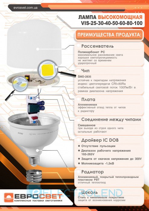 Лампу светодиодную высокомощную ЕВРОСВЕТ 30Вт 6400К (VIS-30-E27) выбирают в помещения, где нужно много света: в класс, мастерскую, склад, цех завода.
