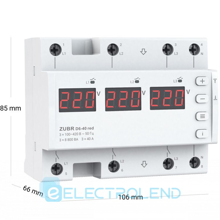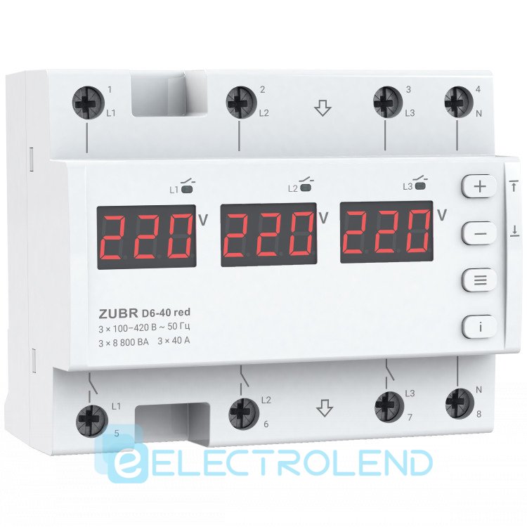 Реле напряжения ZUBR D6-40 red с двумя режимами работы 1 фазного и 3-х фазного напряжения
