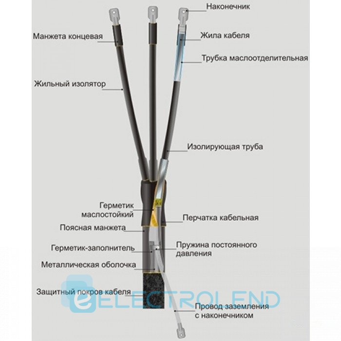 Выравнивание напряжённости электрического поля в корешке разделки кабеля обеспечивается высоковольтной перчаткой и мастичной лентой-регулятором со специально заданными электрическими характеристиками.