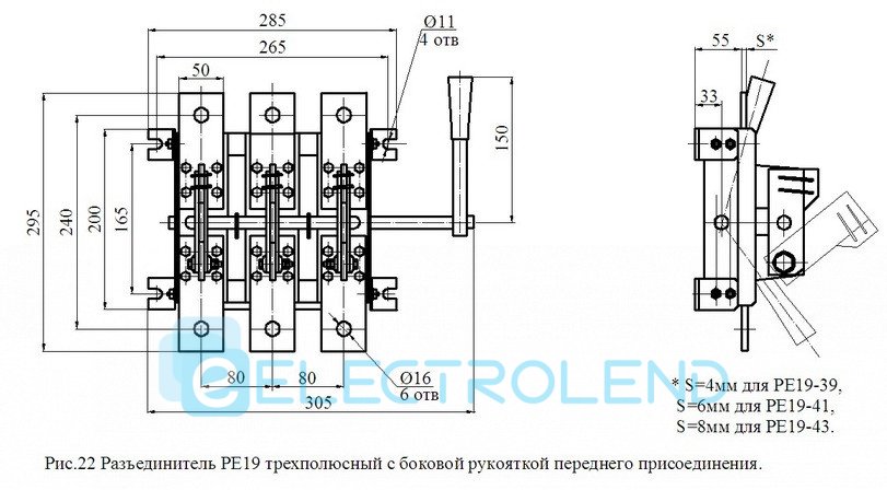 Широкий выбор исполнений разъединителей РЕ19: по номинальному току, виду ручного привода, количеству полюсов, расположению контактных выводов. Изготавливаться разъединители могут на изоляционных секциях или на изоляционной плите. |