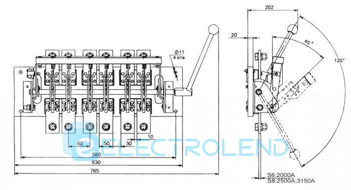 Разъединитель РЕ 19-44-311200 2000А 3Р левый с боковой рукояткой на изоляционной плите (ИП)