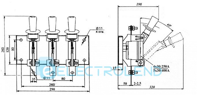 РАЗЪЕДИНИТЕЛЬ РЕ19-31-311700 100А, РЕ19-35-311700 250А И РЕ19-37-311700 400А ТРЕХПОЛЮСНЫЙ ПЕРЕДНЕГО ПРИСОЕДИНЕНИЯ С РУКОЯТКОЙ ДЛЯ ПОПОЛЮСНОГО ОПЕРИРОВАНИЯ.