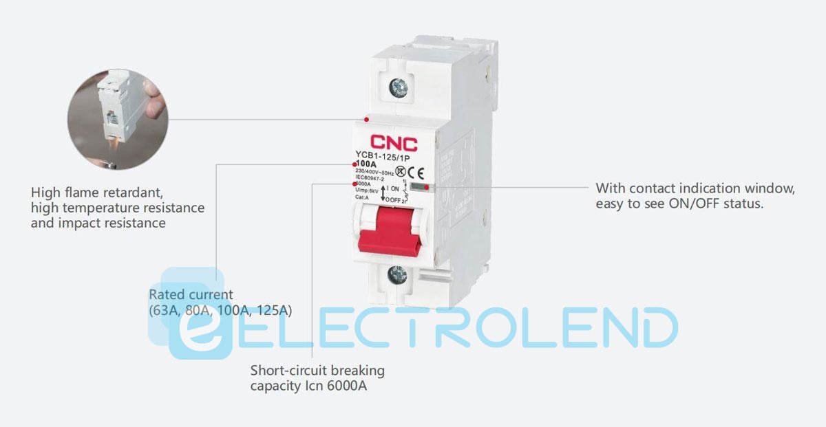 Модульный автоматический выключатель YCB1-125, 1Р, 80А, D, 6kА, CNC