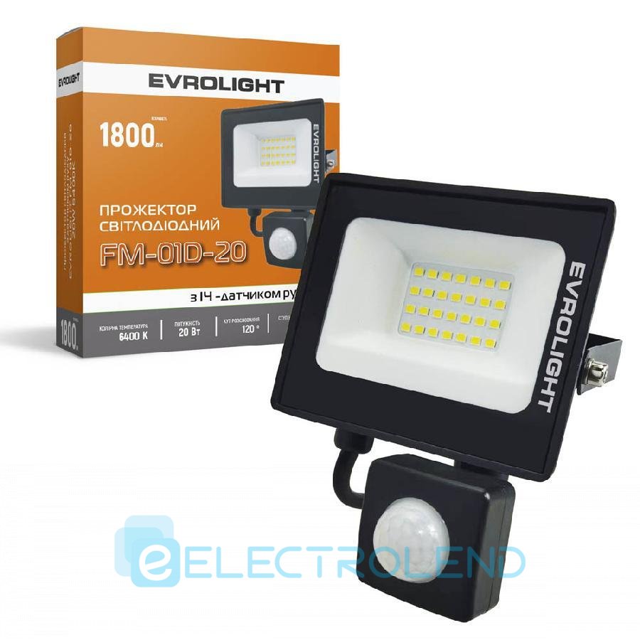 Прожектор светодиодный с датчиком движения EVROLIGHT FM-01D-20 20W 6400К 000057040