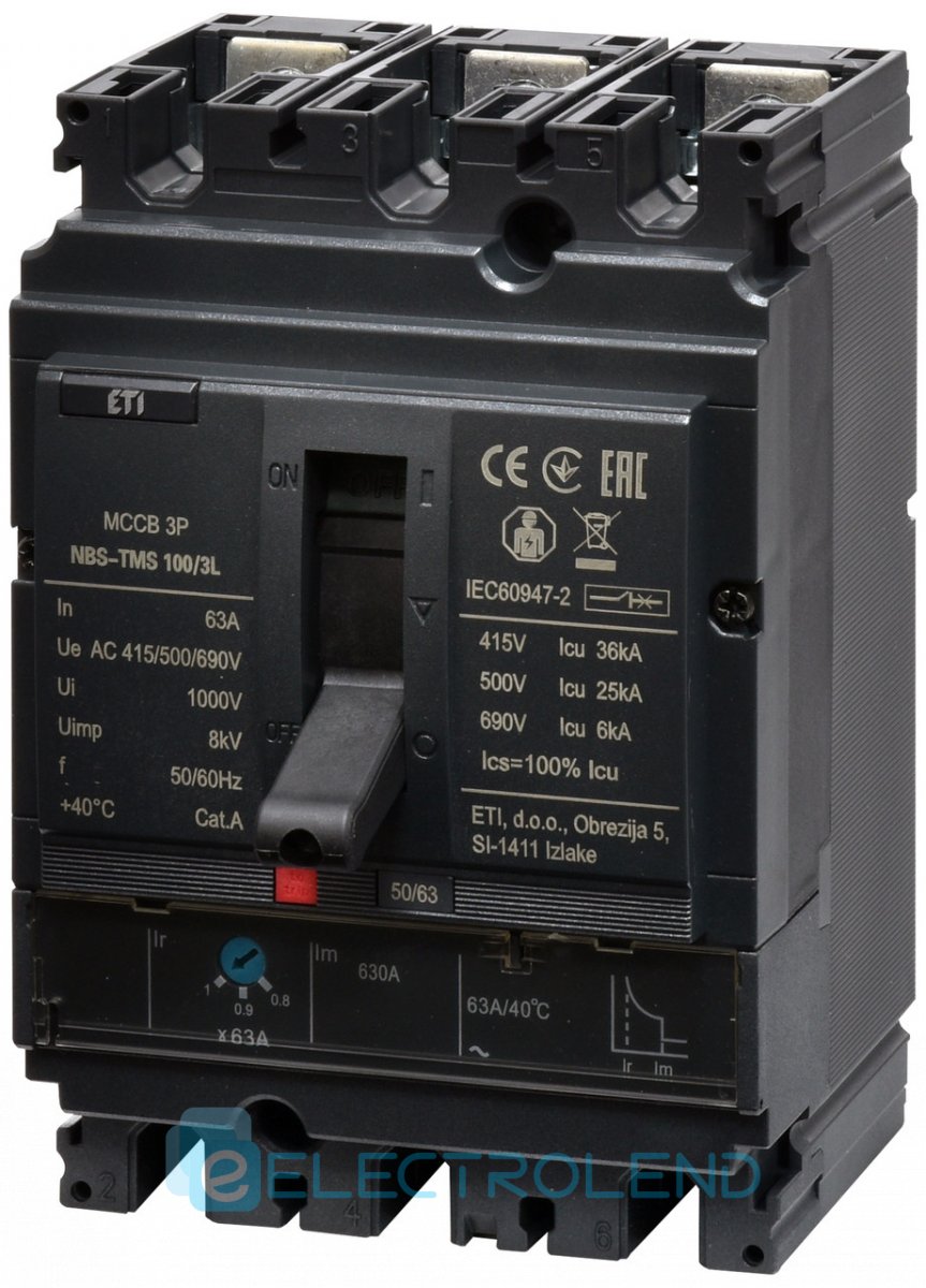 4673005 Авт. выключатель NBS-TMS 100/3L 63A (36kA, (0.8-1)In/фикс.) 3P ETI