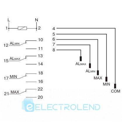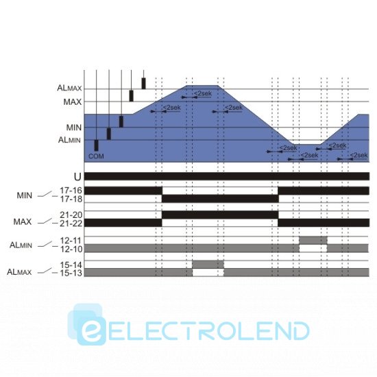 Действие: реле поддерживает уровень жидкости в установленных пределах. Если уровень жидкости снизится ниже уровня МИН (электроды МИН и ЗАГ разомкнуты) - контакт реле МИН переключится в позицию 17-16 (работа НАПОЛНЕНИЕ), а контакт МАКС останется в позиции 21-22. После достижения жидкостью уровня МАКС (замыкаются электроды МАКС и ЗАГ) - контакт реле МИН переключится в позицию 17-18 (работа ОПУСТОШЕНИЕ), а контакт МАКС - в позицию 21-20. Аварийное состояние: Сигн.МИН (состояние ХОЛОСТОГО ХОДА) - в случае снижения уровня жидкости до уровня Сигн.МИН (разомкнуты электроды Сигн.МИН и ЗАГ) контакт Сигн.МИН переключится в позицию 12-11; Сигн.МАКС (состояние ПЕРЕПОЛНЕНИЕ) - при достижении жидкостью уровня Сигн.МАКС (замкнуты электроды Сигн.МАКС и ЗАГ) контакт реле Сигн.МАКС переключится в позицию 15-14.