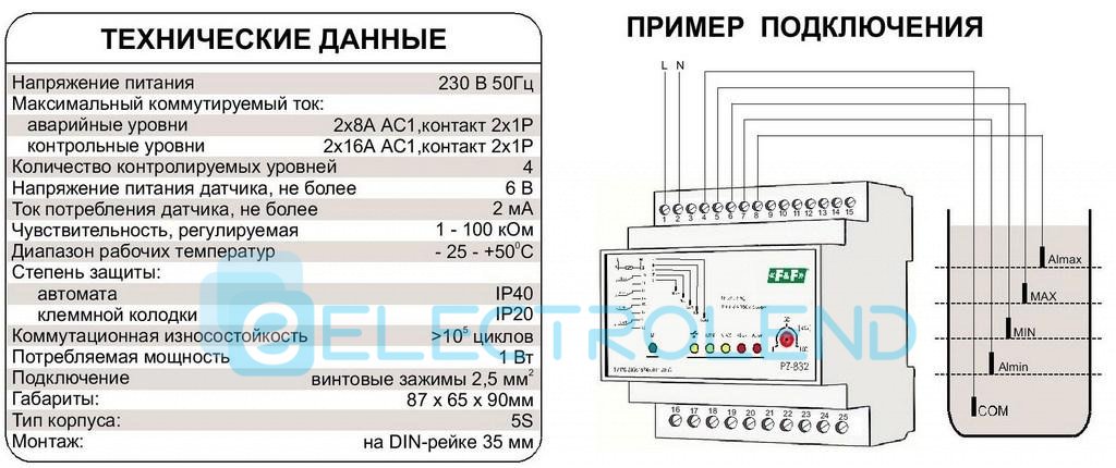 Назначение: реле PZ-832 RC предназначено для выявления наличия жидкости, которая проводит электрический ток на уровне высоты вмонтированных детекторов.