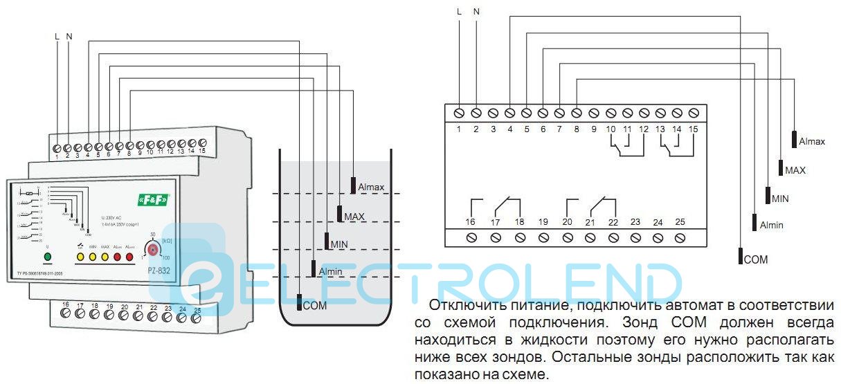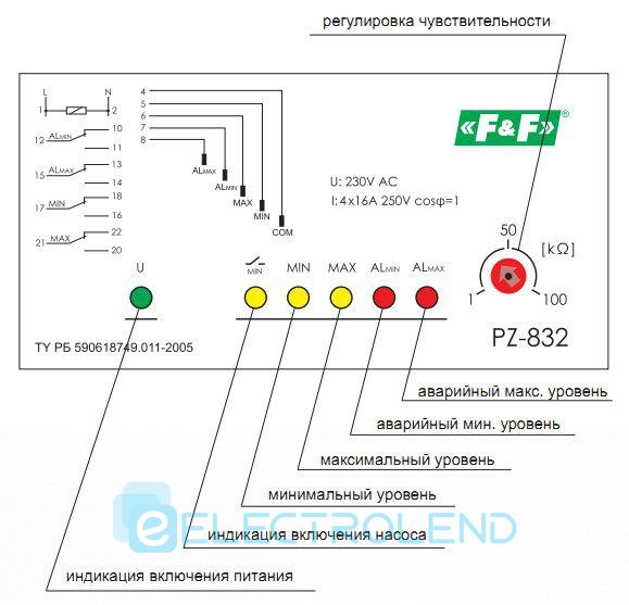 Реле уровня жидкости PZ-832 RC с регулировкой с пятью зондами 16A 3S (ДР-832Р) F&F