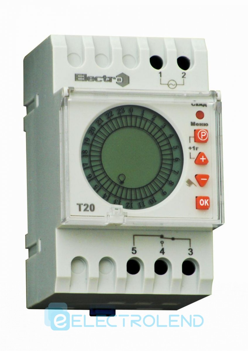 Таймер цифровой Т20 –суточный таймер, предназначенный для включения и отключения оборудования или участков электрической цепи по недельному циклу.