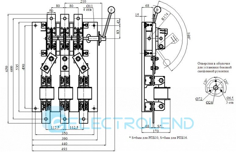 Рубильник РПБ-10 1000А с боковой смещенной рукояткой, с олово, с предохран. 3шт, медно-луж. контакты
