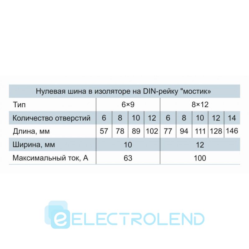 Нулевая "N" шина ШНИ 8 x 12 в изоляторе "мостик" на DIN-рейку 6 отв. до 100А Electro