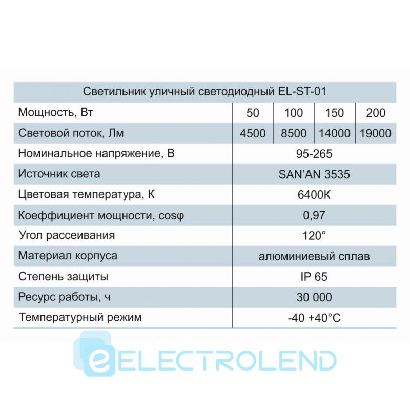 Светильник уличный EL-ST-01, 150Вт, 95-265В, 6400K, 14000Lm, SAN'AN LED, с линзами, IP65, ElectrO
