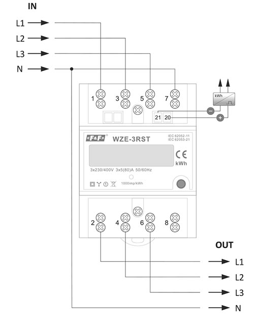 Действие: индикатор WZE-3RST является индикатором энергопотребления в 3-фазной 4-проводной системе. Он имеет дополнительный обнуляемый счетчик энергии. Специальная электронная система под воздействием протекающего тока и приложенного напряжения в каждой фазе генерирует импульсы в количестве, пропорциональном потребляемой в этой фазе электрической энергии. Сумма импульсов от трех фаз, о которой сигнализирует мигающий светодиод, преобразуется в энергию, потребляемую во всей трехфазной системе. Его значение отображается на сегментном ЖК-дисплее. Цифры после запятой обозначают сотые доли кВтч (0,01 кВтч = 10 Втч). Индикатор имеет 1-строчный ЖК-дисплей, позволяющий отображать общее энергопотребление или энергопотребление с момента последнего сброса счетчика. Значение сбрасываемого счетчика отображается на индикаторе посредством отображения знака [r] в первом сегменте дисплея. Для переключения между отображением обнуляемого и итогового счетчика кратковременно нажмите кнопку, расположенную на передней панели. Чтобы вернуться к счетчику полной энергии, еще раз кратковременно нажмите кнопку на передней панели.