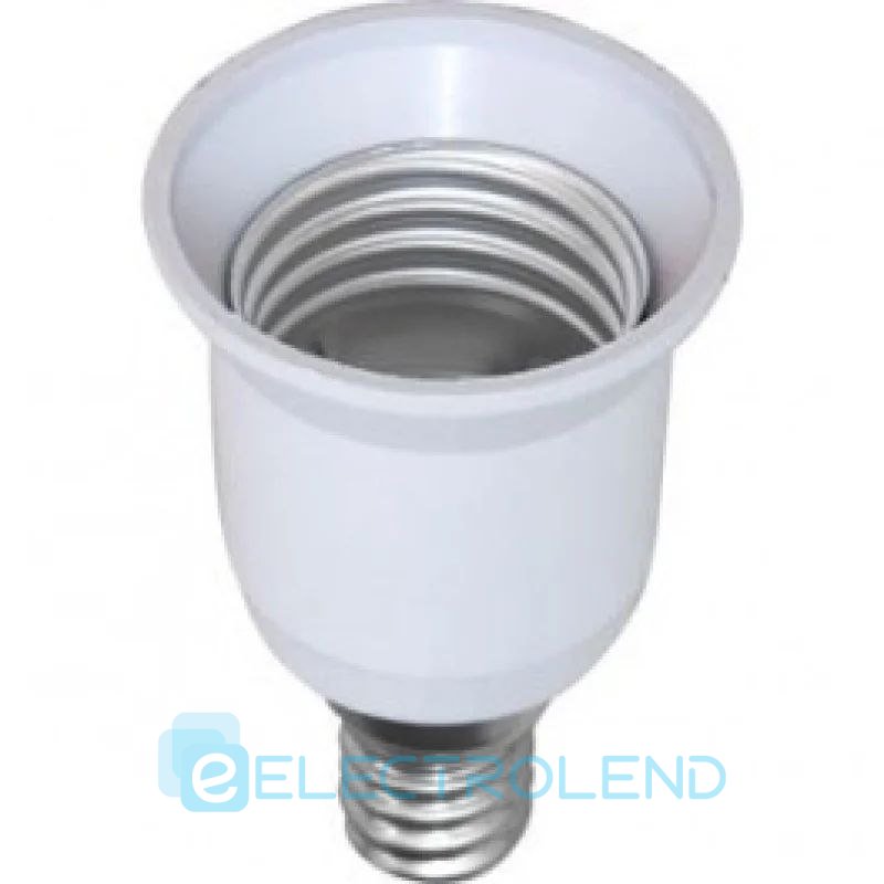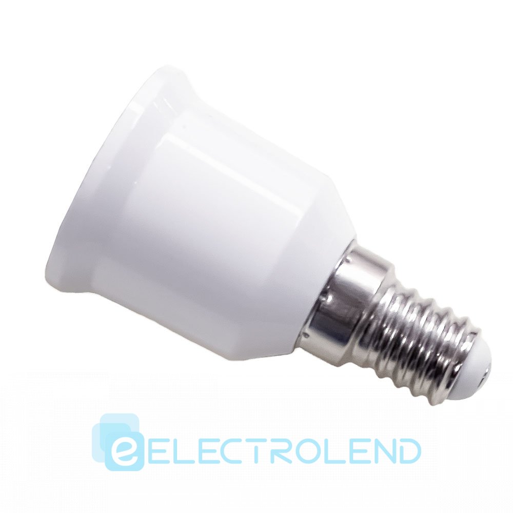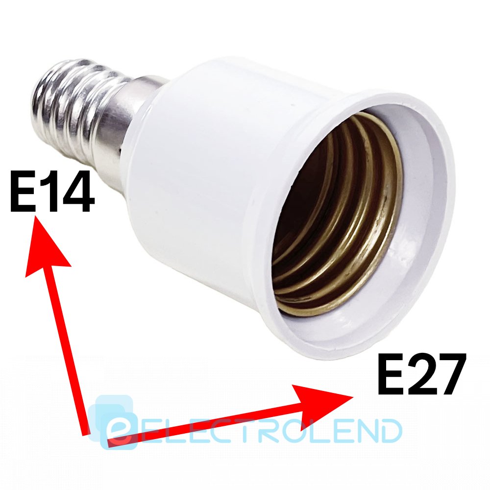 Переходник с цоколя E27 на E14 позволяет устанавливать в светильники с патроном E14 (часто используемые в люстрах) лампочки с цоколем E27. Перед использованием переходника нужно убедиться, хватит ли места в светильнике: переходник добавляет 6,5 см длины к лампочке. Также некоторые люстры имеют мало пространства, чтобы вместить лампу с колбами, используемыми для ламп E27.