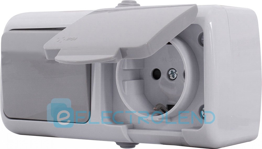 Розетка с з/к + выключатель одноклавишный e.aqua.1234.grg, для наружного монтажа, IP54, серая s035070