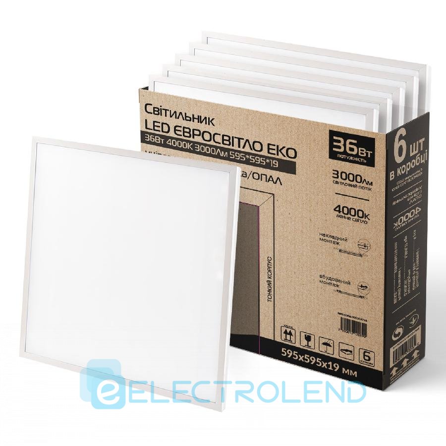 Светильник LED ЕВРОСВЕТ ЭКО 36Вт 4000К 3000Лм 595*595*19 универсальный/лента/ОПАЛ 000058748