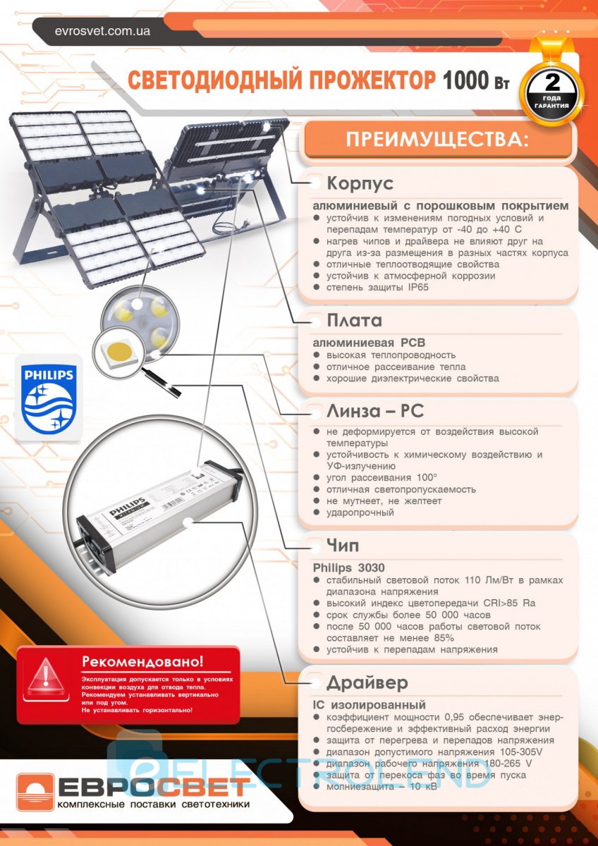 Прожектор світлодіодний ЕВРОСВЕТ 1000Вт 6400К EV-1000-01 PRO 110000Лм 000040314